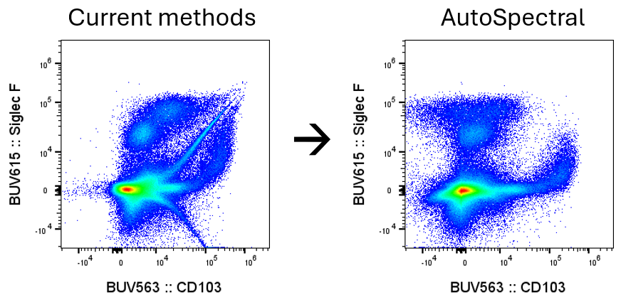 A few of these issues might be tackled (partially) by a extremely expert circulate cytometrist, keen to spend days on every unmixing matrix, manually choosing populations for optimistic and destructive cells and working a number of units of calculations relying on which markers they need to assess. AutoSpectral does all of it in a totally automated pipeline, utilizing a sturdy statistical mannequin that’s extremely reproducible and visibly reduces the error.